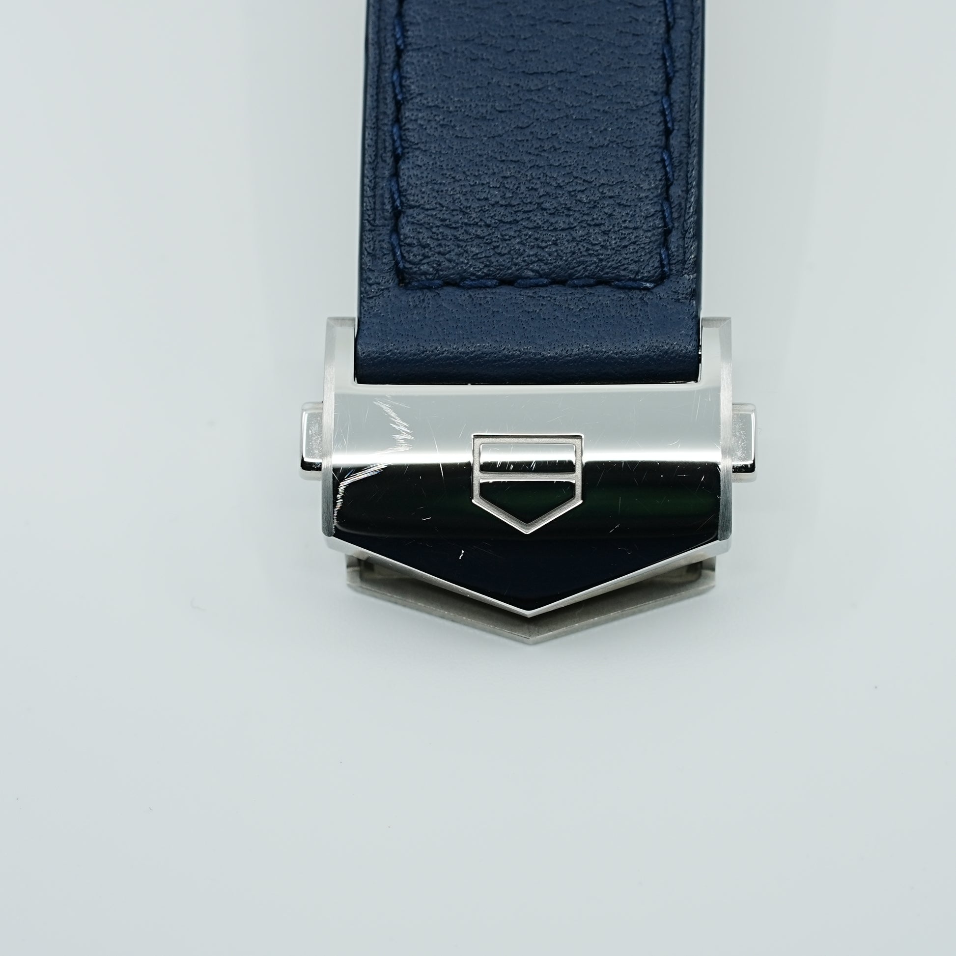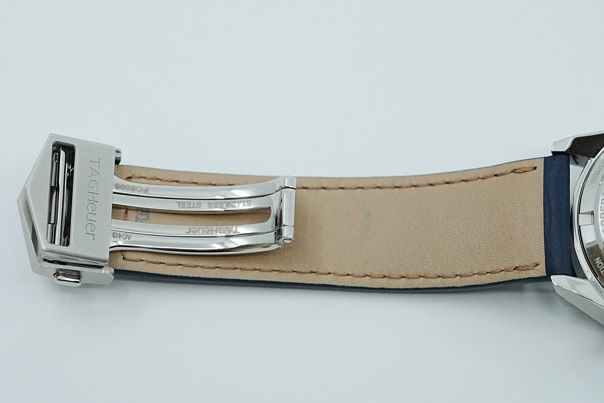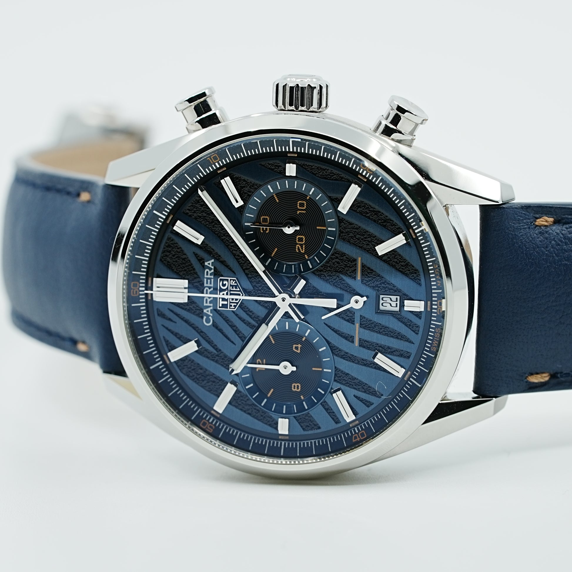 トミヤ×タグホイヤー 90本限定特別モデル。文字盤はヘアライン仕上げの入ったウェーブ柄ブルーPVDの上層と、アスファルトエフェクトをかけた粒状仕上げのブラック下層仕上げ。ユニークなブルー仕上げのダイアルに、ブルーのカーフスキンのストラップが美しくマッチ。