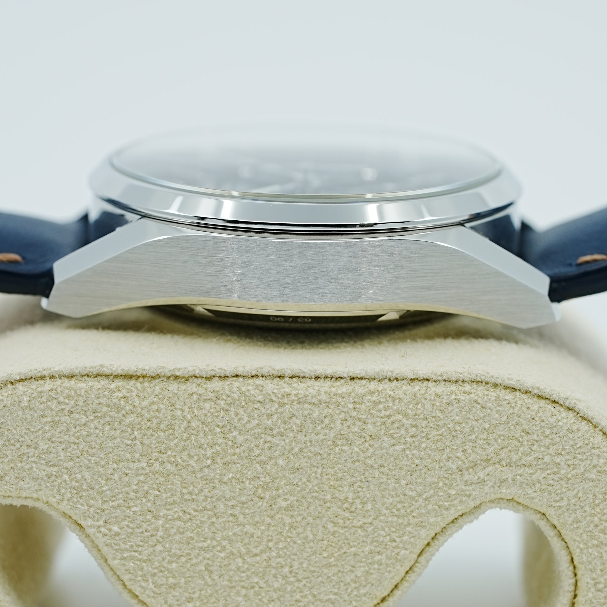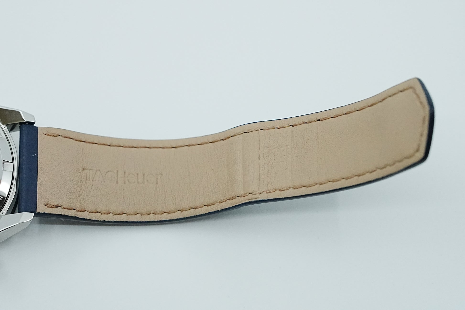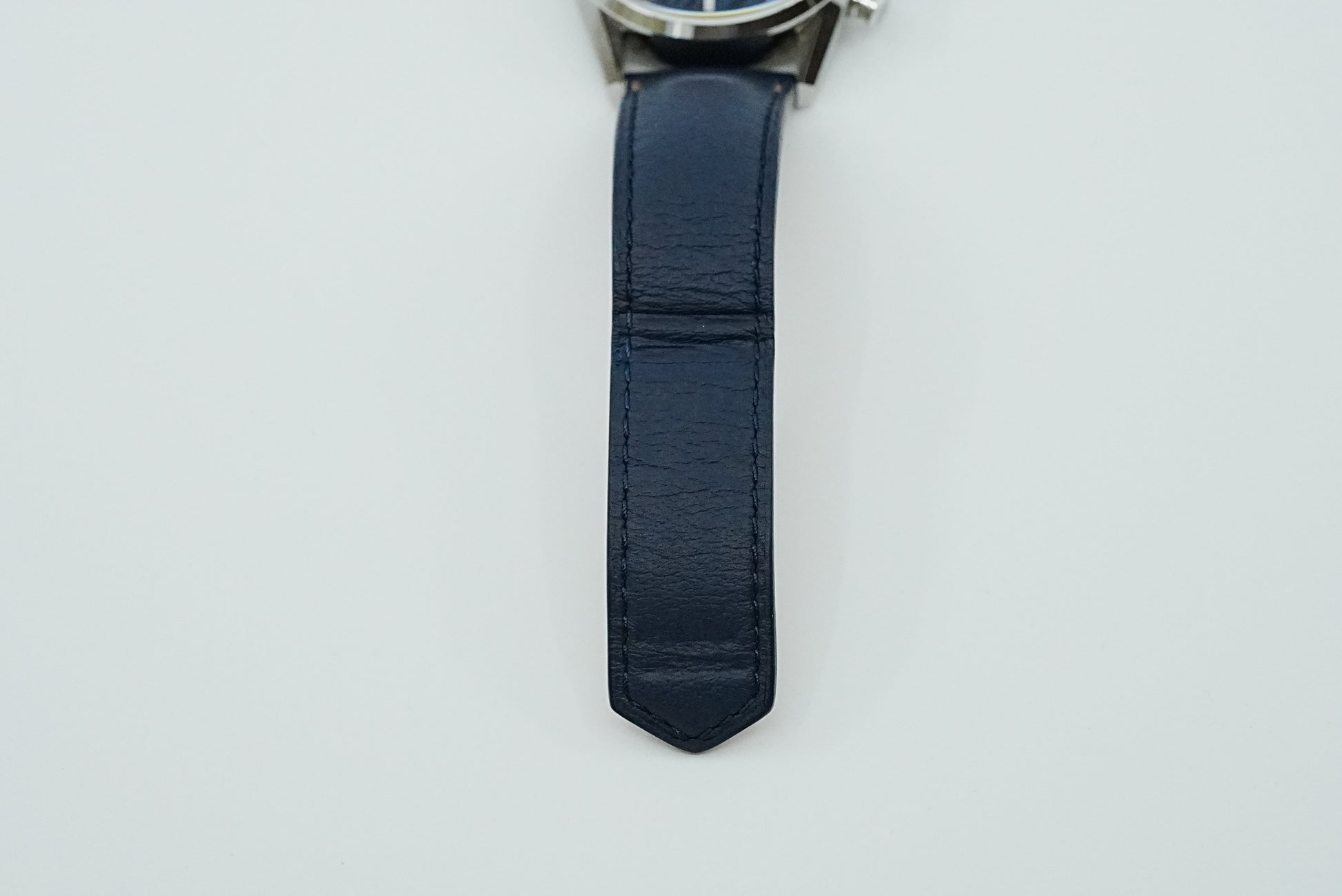 トミヤ×タグホイヤー 90本限定特別モデル。文字盤はヘアライン仕上げの入ったウェーブ柄ブルーPVDの上層と、アスファルトエフェクトをかけた粒状仕上げのブラック下層仕上げ。ユニークなブルー仕上げのダイアルに、ブルーのカーフスキンのストラップが美しくマッチ。